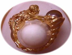 One-of-a-kind! This gal wraps right around your finger, to show off her treasure from the sea. Crafted in 14KT yellow gold, with a 9 mm Black Tahitian Pearl in her cornucopia, this gracefully designed ring makes a perfect index finger ring. She is crafted with the finest details, right down to her arms and feet. Her long flowing hair cascades down her back, and leaves cover her torso. Definitely a conversation piece. Your cost $890.00 |