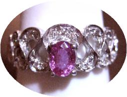 beat, especially if you love pink! This utterly feminine ring is encrusted with diamonds, about one-twentieth of a carat of them. Set in the center swirl is a bright icy pink genuine 1/2 ct sapphire, that measures 5 x 4.25 mm. Not a one-of-a-kind, but we only have this one!